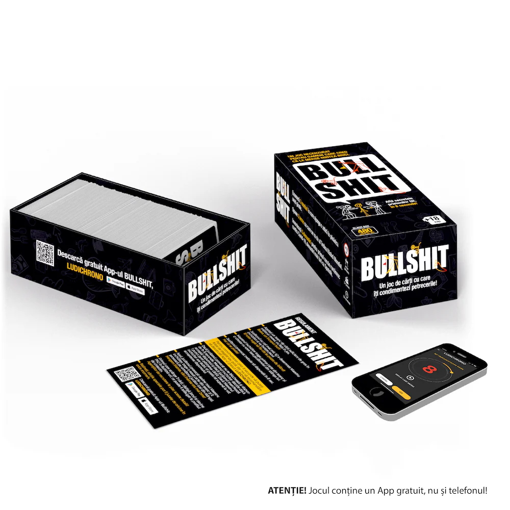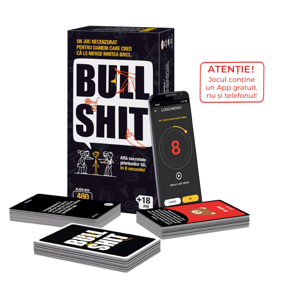 Bullshit joc lb. romana- este un joc de carti cu care veti condimenta petrecerile, un joc necenzurat si fara tabuuri pentru minti murdare, descoperiti cele mai ascunse secrete ale prietenilor vostri, in doar 8 secunde.